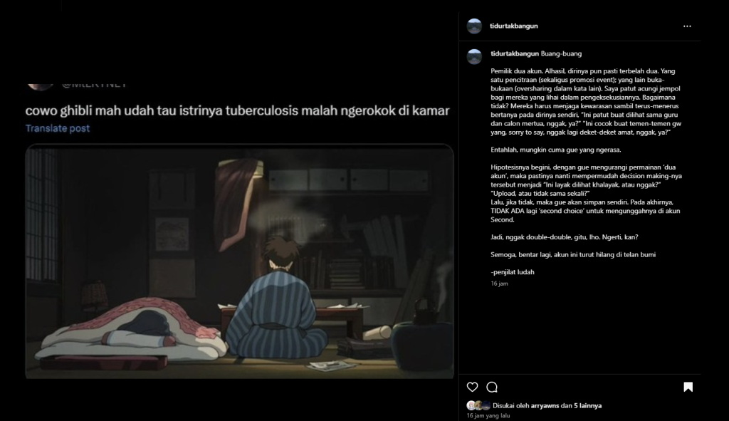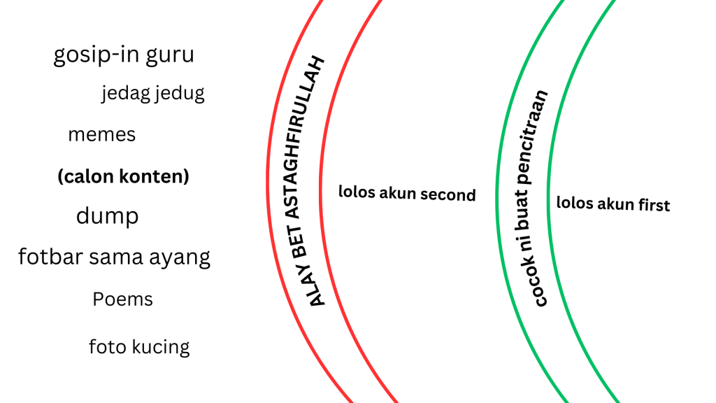Di awal tadi, mungkin kita bisa setuju bahwa second account dapat memberikan sedikit keleluasaan lebih untuk berekspresi ketimbang akun utama yang cenderung kaku sebab banyak pencitraan. Namun, yang namanya bersosialisasi dengan manusia lain, tetap dibutuhkan suatu batasan atau tembok. Nah, di sini lah bagian lucunya tiba. Yang awalnya (dengan akun utama) kita hanya perlu mempertimbangkan “Ini layak untuk diunggah ke publik, atau nggak, ya?” Dengan hadirnya second account, bertambah satu tembok lagi dimana yang pertama: “Ini layak buat dilihat sama guru dan calon mertua, nggak, ya?” Lalu, dilanjutkan tembok yang kedua: “Ini cringe kalau dilihat temen-temen, nggak, ya?” Karna siapapun audiens (followers) kita, pasti ada rasa ingin untuk orang itu melihat/memandang kita seperti apa yang kita inginkan. Buktinya, kita masih merasa cringe atau malu di beberapa kondisi, yang padahal itu adalah second account yang katanya ‘bebas’. Begitu rumit dan melelahkan hanya untuk dijelaskan, apalagi dirasakan sendiri.