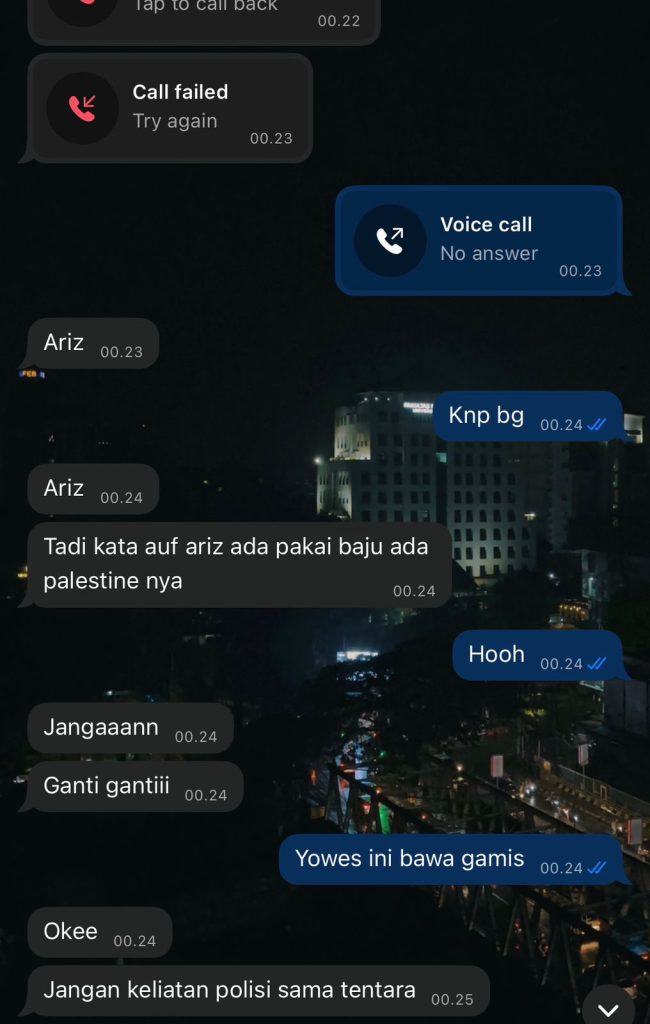 Dalam cerita ini, sayangnya, Aku tak ditangkap polisi. Sepulangnya di hotel, bang Fariz buka suara bahwa Ia seorang lah yang pernah dipersekusi sebab pakai baju Palestina.